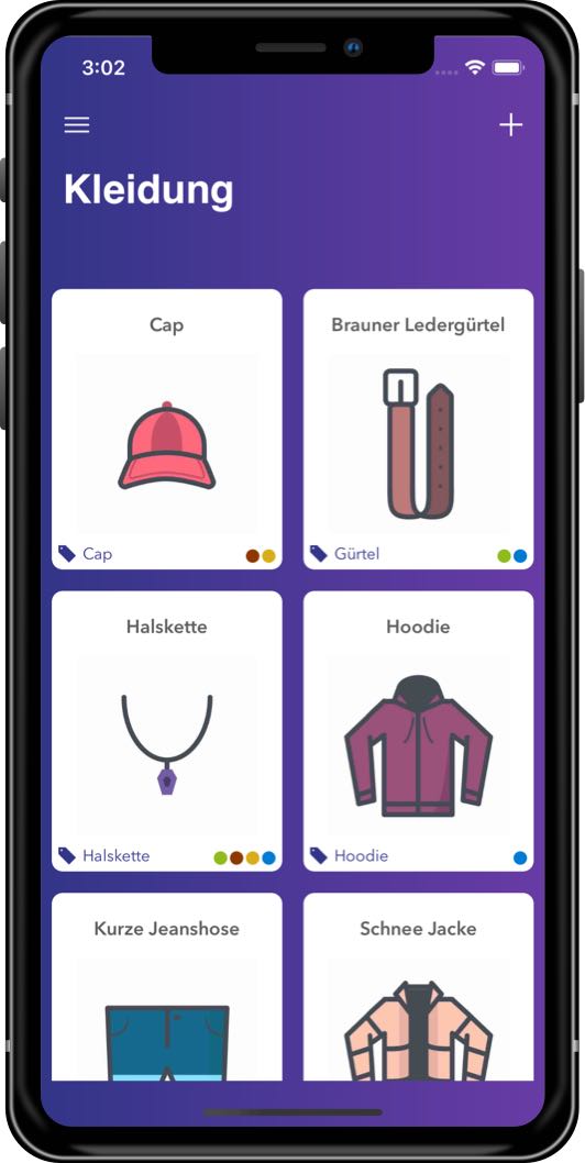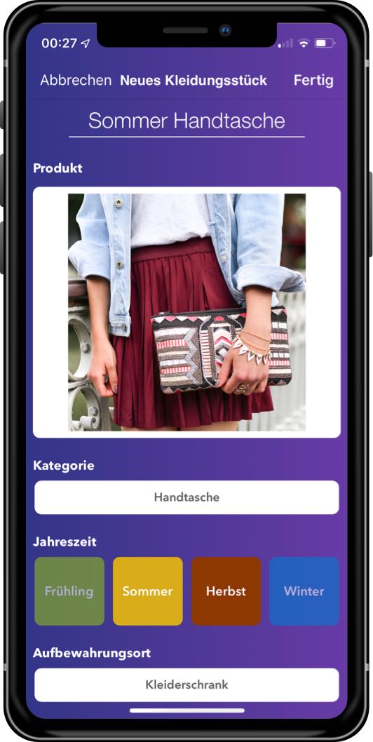 Nutze verschiedene Optionen für Deine Kleidungsstücke, mit denen Du sie z.B. den ensprechenden Jahreszeiten zuordnest. Es sind weitere Updates geplant, die den Funktionenumfang erweitern werden, damit Du Deine geliebten Kleidungsstücke noch besser verwalten kannst.